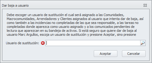 El usuario quedará marcado como baja y el usuario asignado como sustituto pasará a ser el asignado en sus comunidades y en las incidencias, tareas y comunicados que tuviera pendientes.