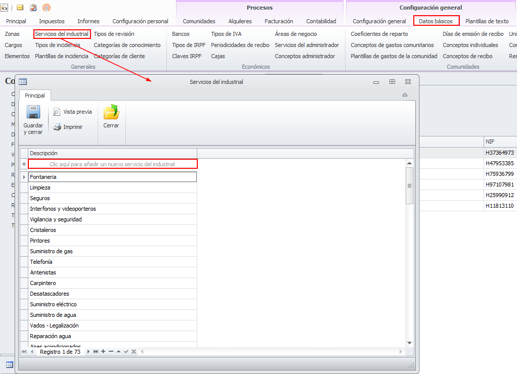 Para añadir o modificar cargos, debe ir al menú Configuración general / Datos básicos, y escoger la opción Servicios del industrial del apartado Generales.