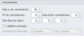 Días a 1er vencimiento: Es el número de días que se sumarán a la fecha de emisión de la factura para calcular el primer vencimiento. Si se deja este dato a cero, la fecha de emisión y la fecha de vencimiento será la misma.
