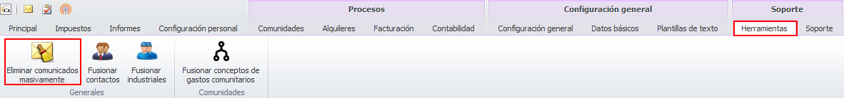 Acceda al menú Herramientas y haga clic en el botón Eliminar comunicados masivamente.