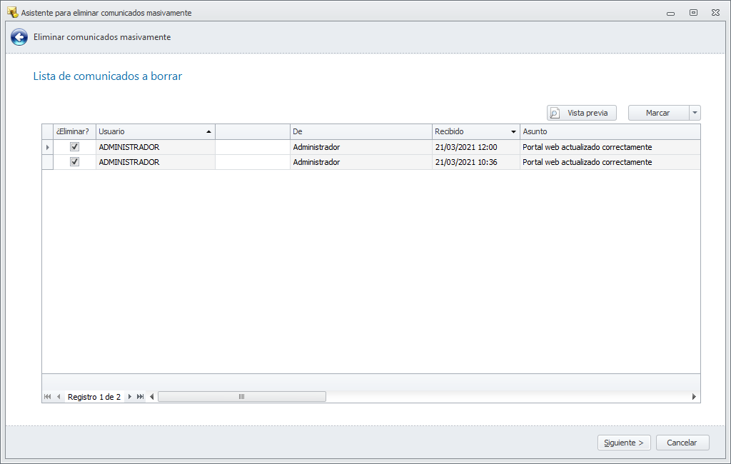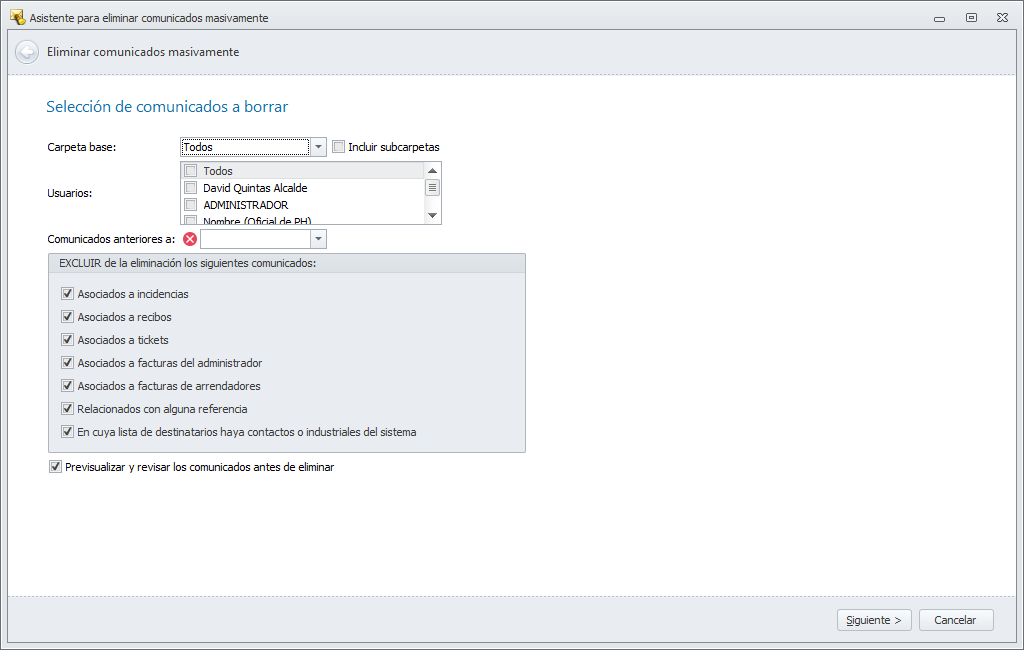 Previsualizar y revisar los comunicados antes de eliminar. Si deja esta casilla activa, se mostrarán los comunicados que van a ser eliminados.