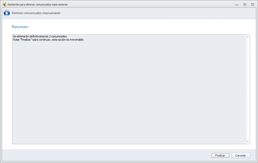 La última ventana del asistente muestra un resumen de los comunicados que van a ser eliminados. Haga clic en Finalizar para culminar la eliminación.