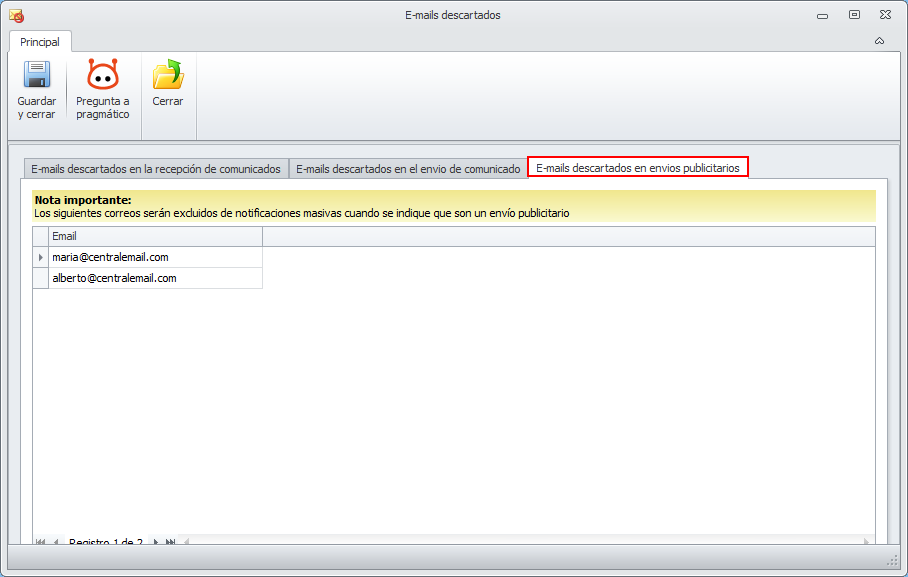Se trata de una lista de direcciones de correo a la que se accede mediante el botón Emails descartados del menú Configuración general.