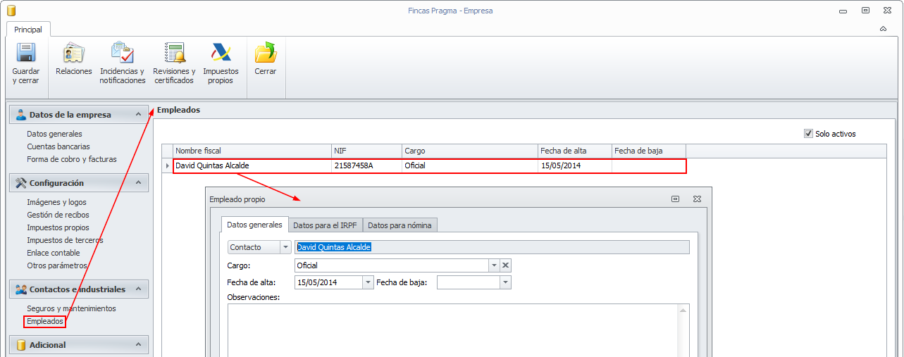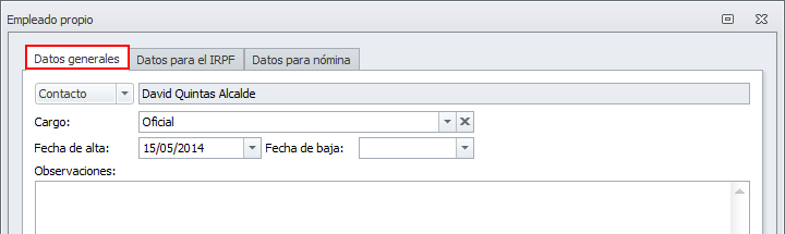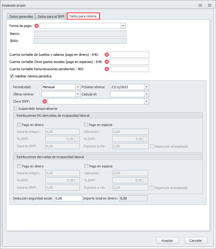 Los datos de esta pestaña, por sí solos, no suponen ningún pago ni movimiento contable. Serán usados para generar los registros de pago de nómina de los empleados. Esos registros de pago de nómina sí que supondrán, cuando se lleve a cabo el pago, la contabilización de la nómina para el administrador.