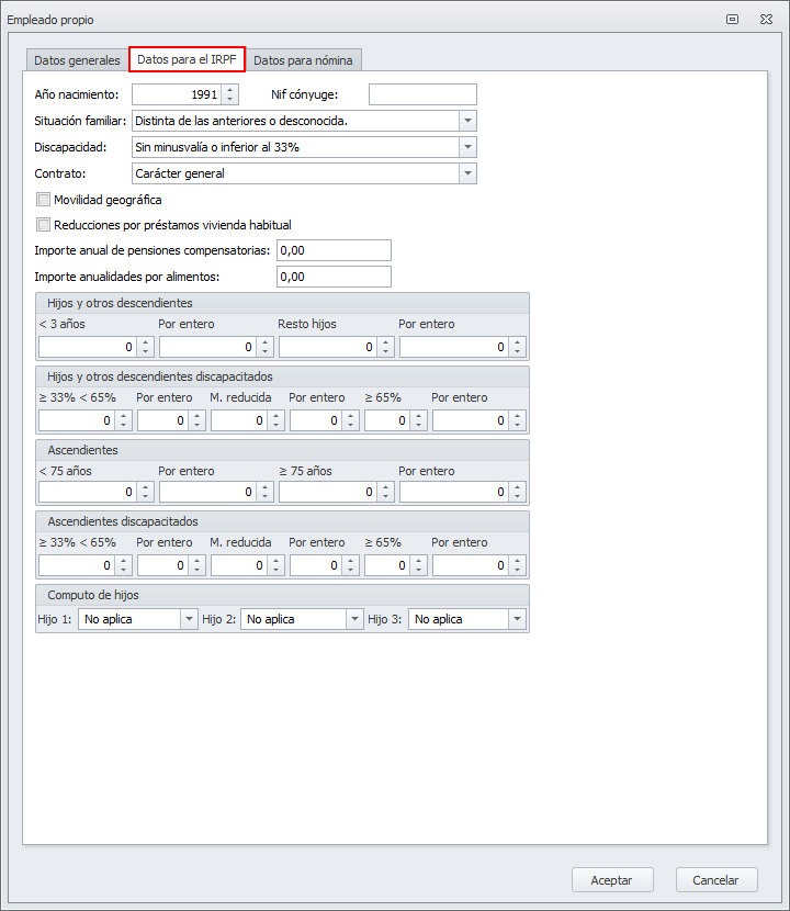 Especifique las características del contrato y la situación familiar del empleado. Estos datos son de especial importancia para cumplimentar el modelo 190.
