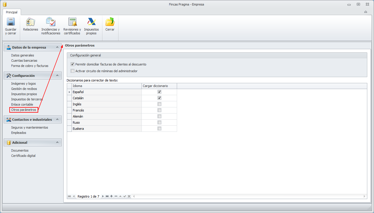 La sección Otros parámetros contiene parametrizaciones no relacionadas con ninguna de las otras secciones de datos de la ficha de empresa.