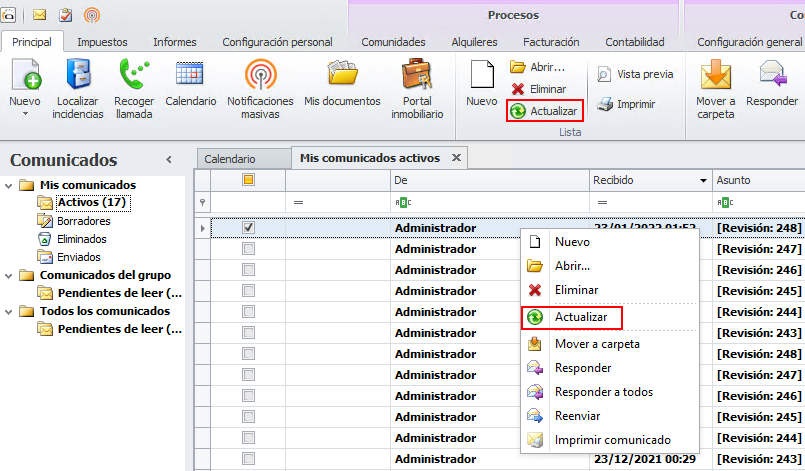 Por defecto, los comunicados son actualizados en la lista de comunicados activos cada 5 minutos, a excepción de que el usuario fuerce la actualización.
