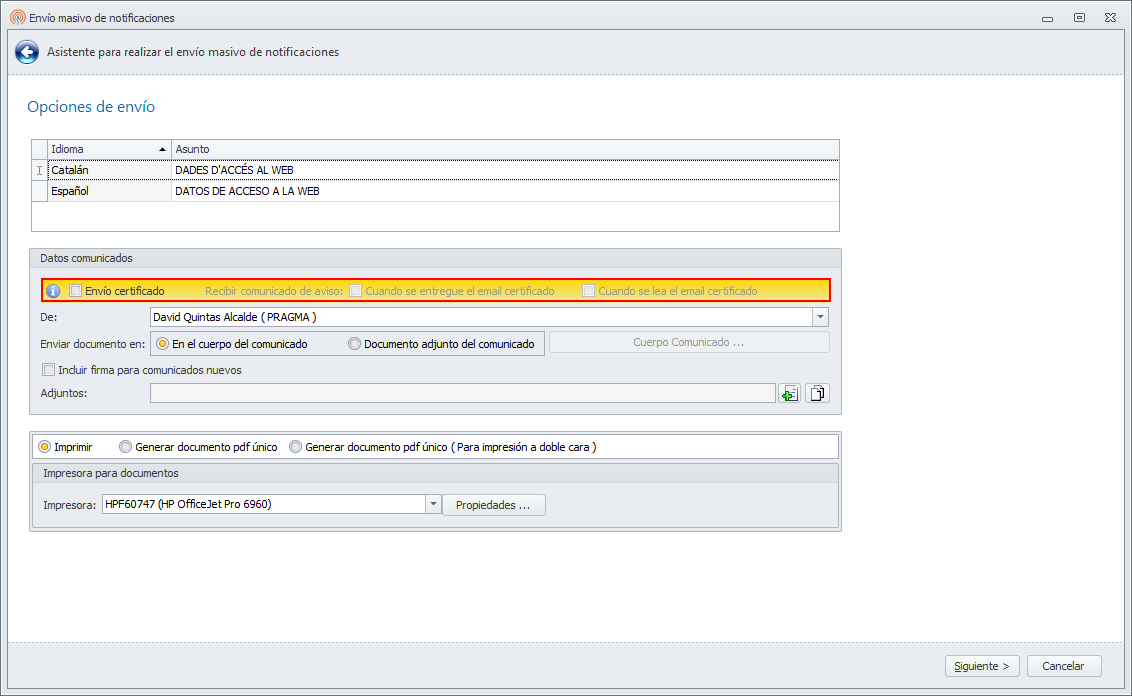 Algunas opciones de envío de notificaciones permiten realizar el envío de comunicados certificados.