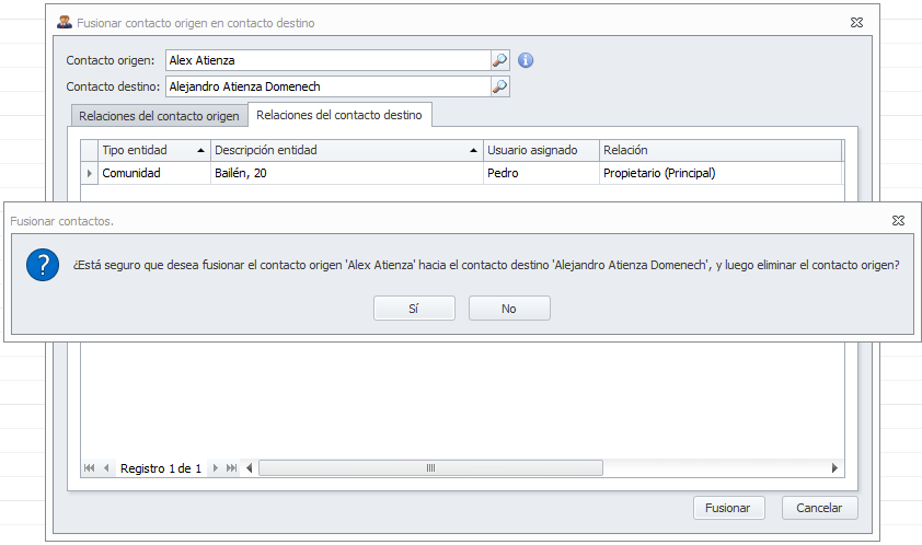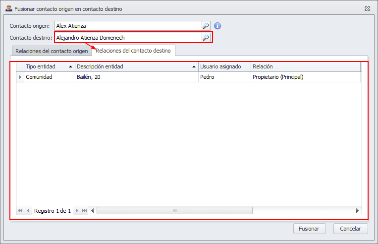 Todos los elementos asociados con el Contacto origen (contratos de propiedad y alquiler, recibos, cobros pagos individuales, mandatos de domiciliación, cobros anticipados, formas de contactar, direcciones postales, cuentas bancarias, etc.) serán traspasados hacia el Contacto destino.
