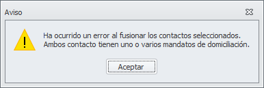 Antes de iniciar el proceso se comprueba si ambos contactos tienen mandatos de domiciliación. En ese caso se muestra este mensaje y no se realiza la fusión. Deberá acceder a los mandatos y eliminar el de uno de los contactos y volver a realizar la fusión.