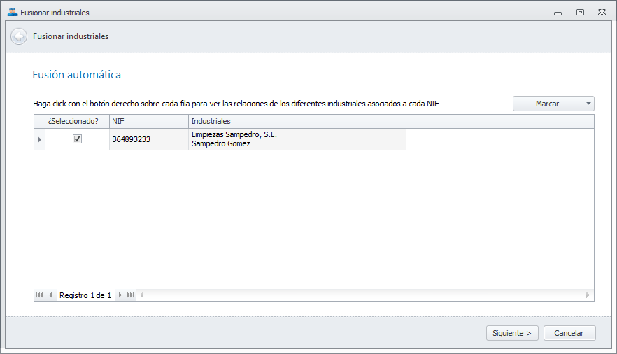 Tras realizar la fusión de los que tienen NIF coincidente, aparecerá la siguiente ventana: