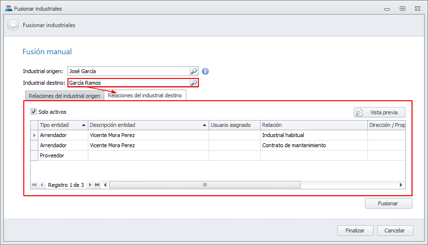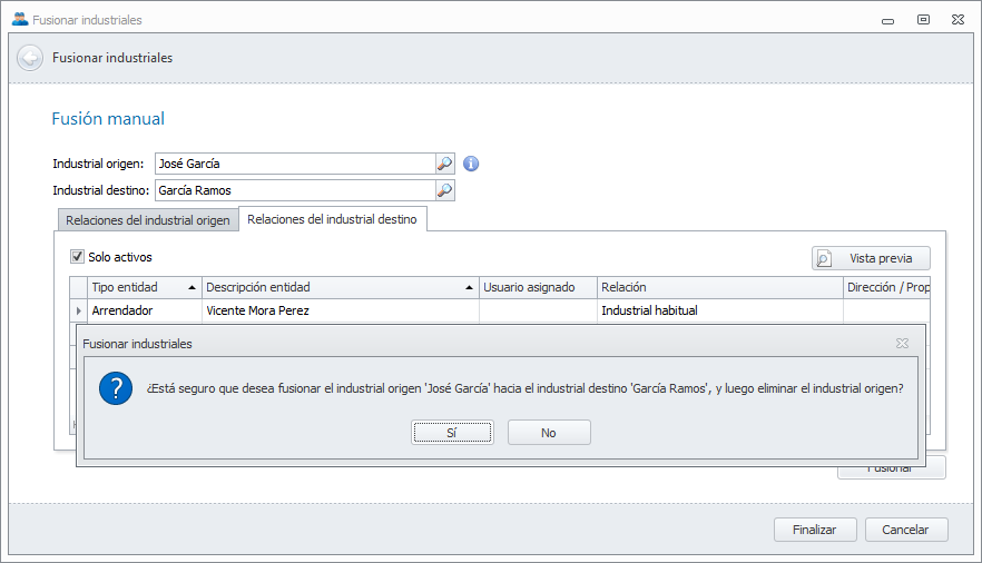 Todos los elementos asociados con el Industrial origen (teléfonos, direcciones, contactos, relaciones, previsiones, facturas, etc.) serán traspasados hacia el Industrial destino.