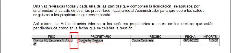 Las plantillas de texto, incluyen con frecuencia tablas de datos variables. Puede ser que al redimensionar la anchura de las columnas, el cambio no afecte a la cabecera y a las líneas a la vez, como puede ver en la siguiente imagen.