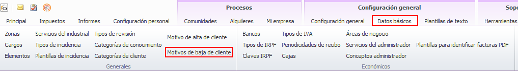 El administrador puede establecer los Motivos de baja de cliente en el menú Datos básicos.