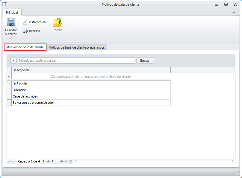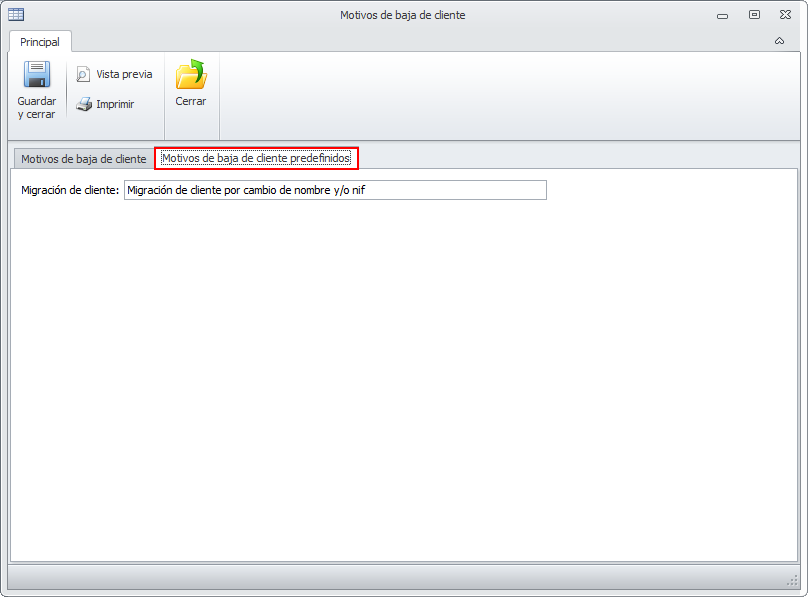 Motivos de baja de cliente. Se trata de una lista en la que puede introducir los motivos que necesite. La siguiente imagen muestra un ejemplo de motivos.