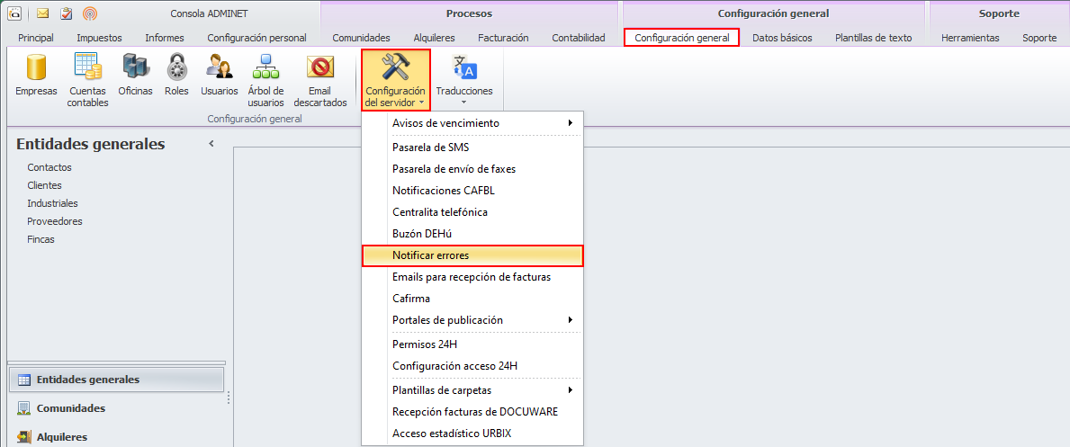 Para configurar la notificación de errores del servidor, vaya al menú Configuración, haga clic en el botón Configuración del servidor y escoja Notificar errores.