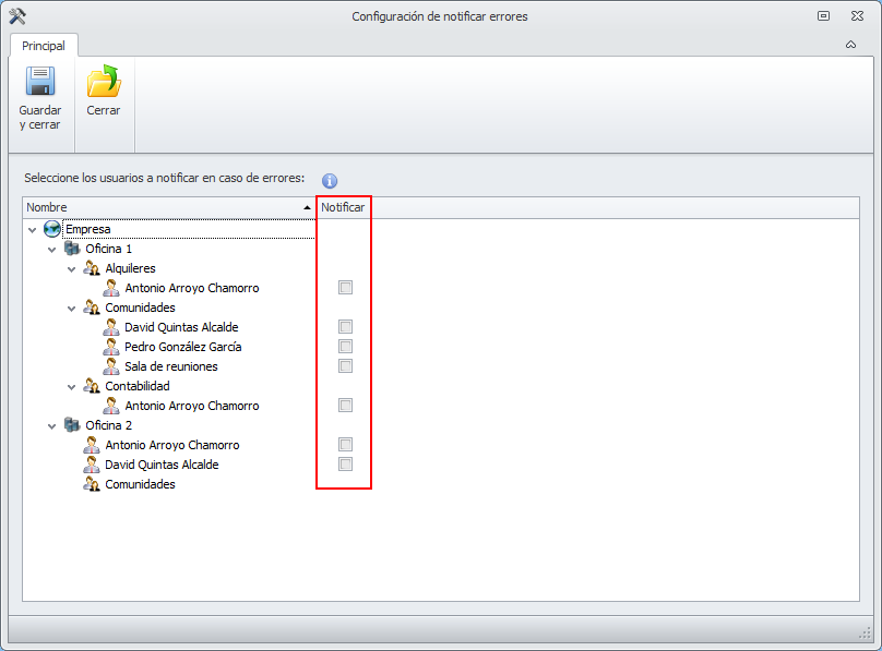 Se muestra la lista de usuarios para que se seleccione aquellos a los que se deben notificar. Si lo desea, puede escoger más de uno. Recuerde Guardar y cerrar para guardar los cambios.