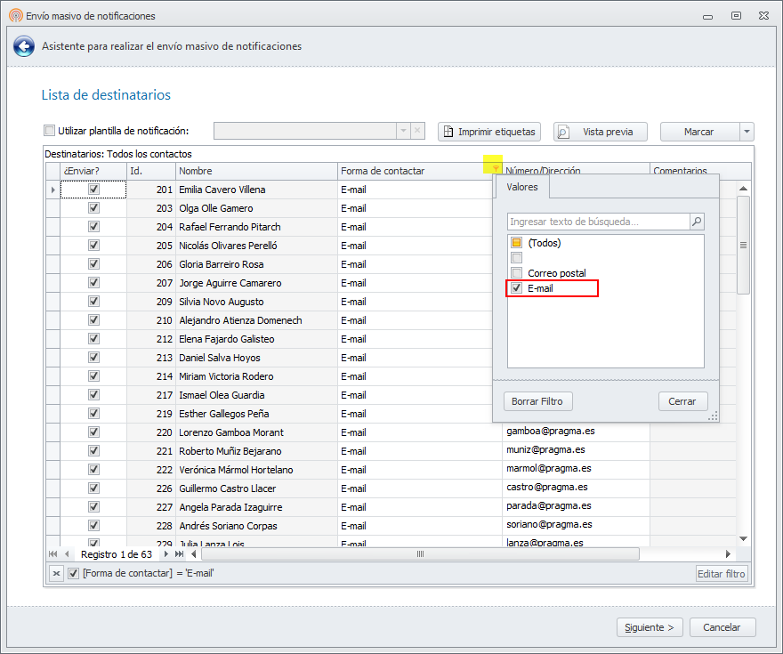 Para quitar de la lista las direcciones postales, abra el filtro de la columna Forma de contactar y active el valor E-mail. En la lista de destinatarios sólo quedarán las direcciones de correo electrónico.