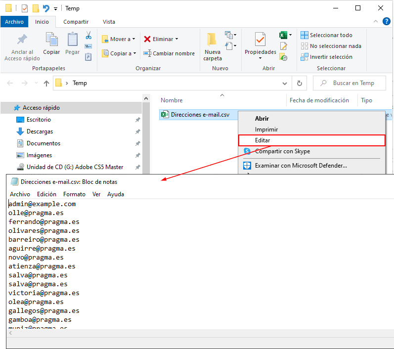 Si desea comprobar el contenido del archivo csv, localícelo, haga clic derecho sobre él y escoja Editar.