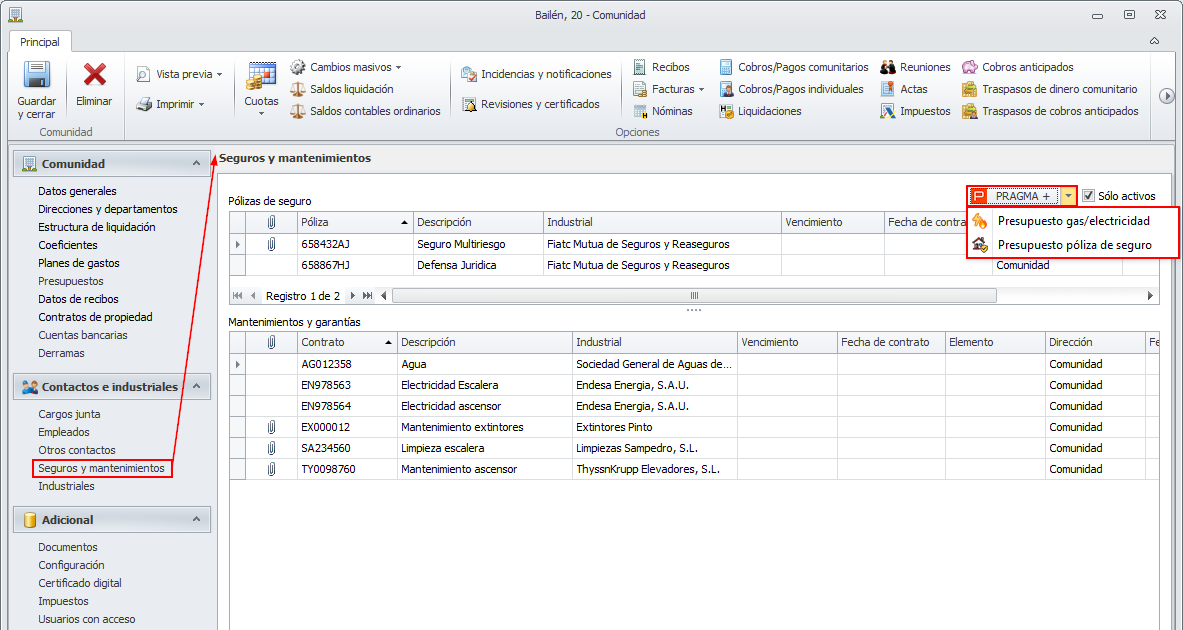 En la sección Seguros y mantenimientos de las fichas de comunidad y macrocomunidad, se dispone de un botón relacionado con el entorno PRAGMA + que permite solicitar presupuestos de gas/electricidad o de pólizas de seguros para esa comunidad.