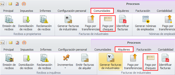 Se accede mediante el botón Pago por cheques que se puede encontrar en los submenús Comunidades y Alquileres del menú Procesos.