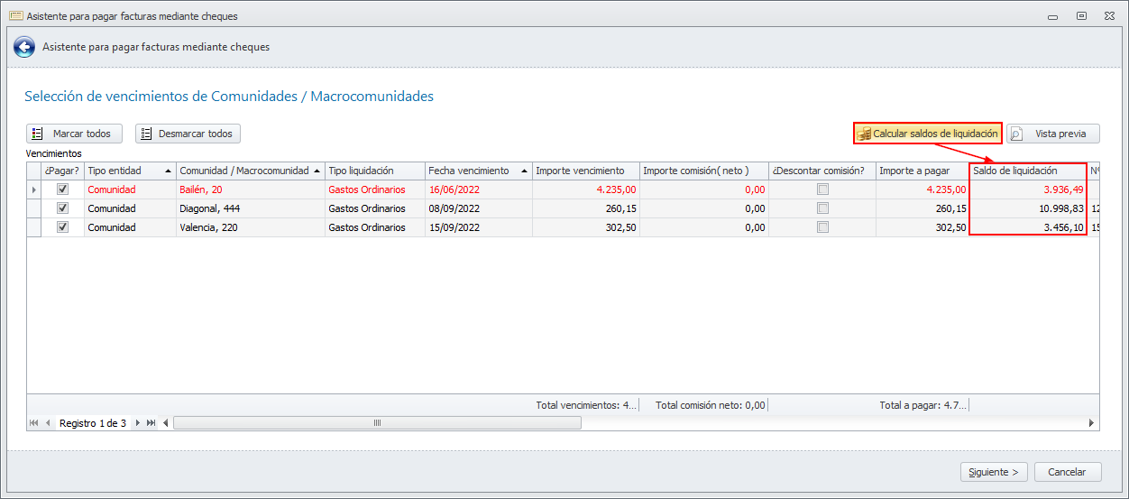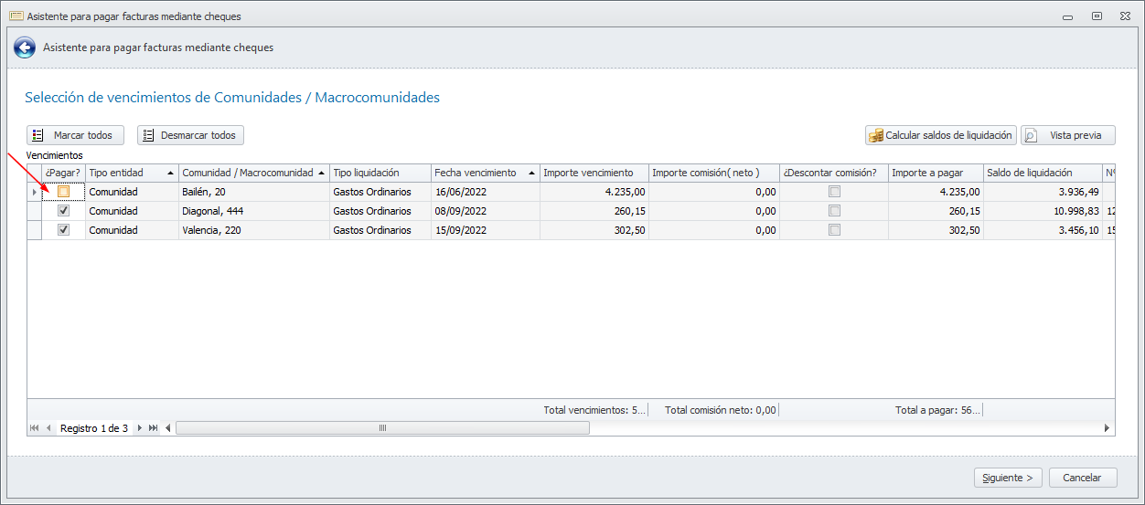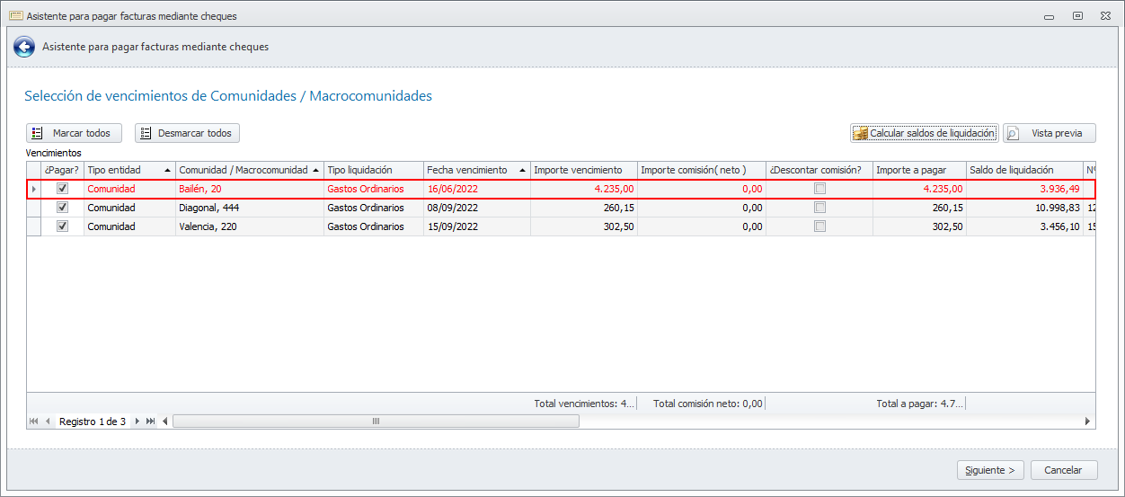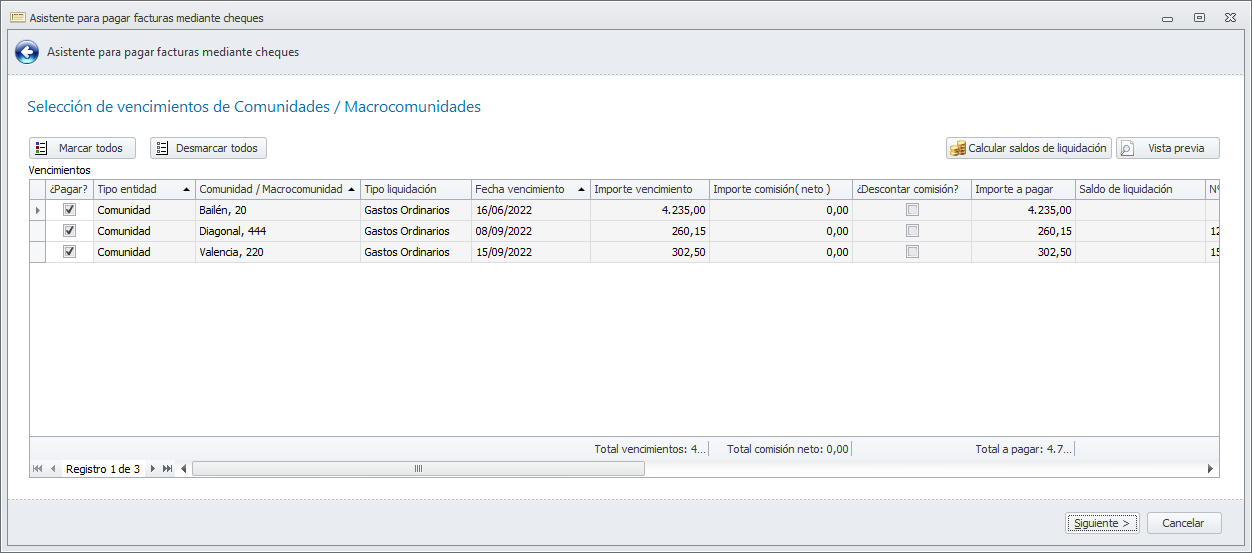 Haga clic en Siguiente. El programa selecciona y muestra las facturas de industriales pendientes de pago (de comunidades o alquileres) cuya fecha es menor o igual a la de la casilla Pagar hasta fecha y cuya forma de pago es Cheque, envío por correo o Cheque, pasan por despacho.