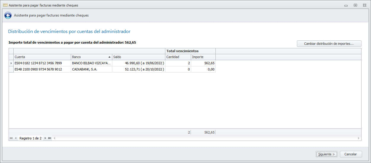 Sólo en el caso de que el administrador disponga de más de una cuenta bancaria, se mostrará esta ventana en la que permitirá repartir el pago entre ellas. Haga clic aquí para ver cómo funciona el botón Cambiar distribución de importes.