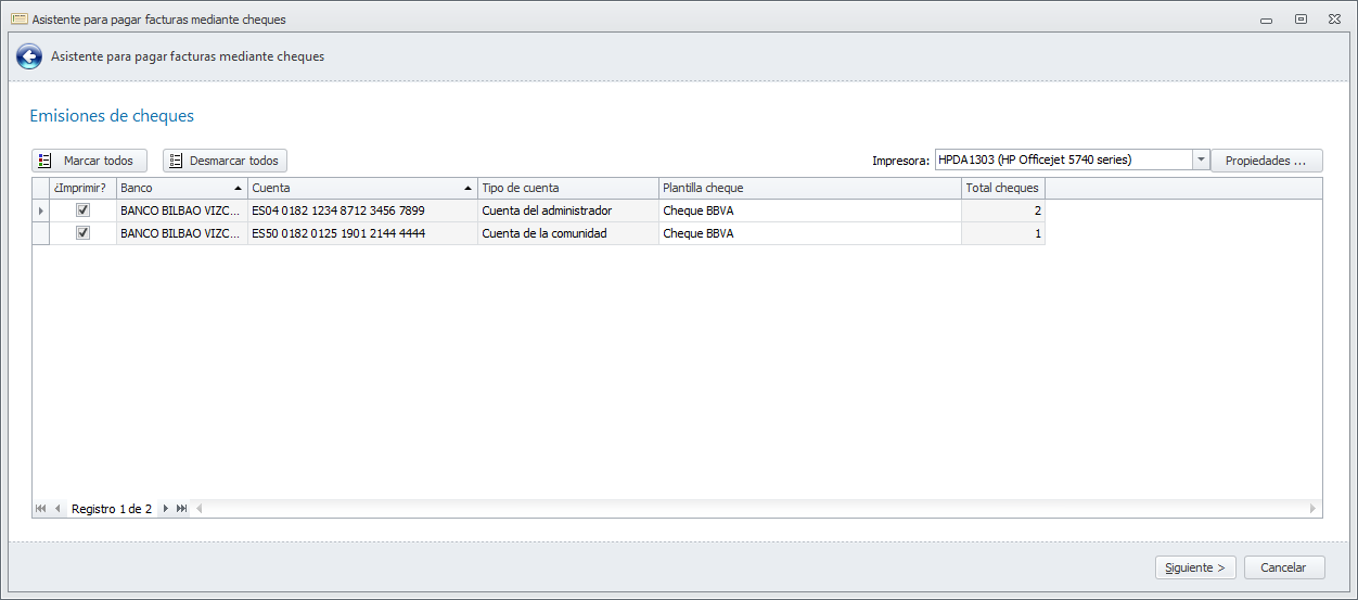 También muestra una lista con las entidades de las que van a emitir los cheques. Si hay cheques que se pagan desde la cuenta de la comunidad, también se muestran.