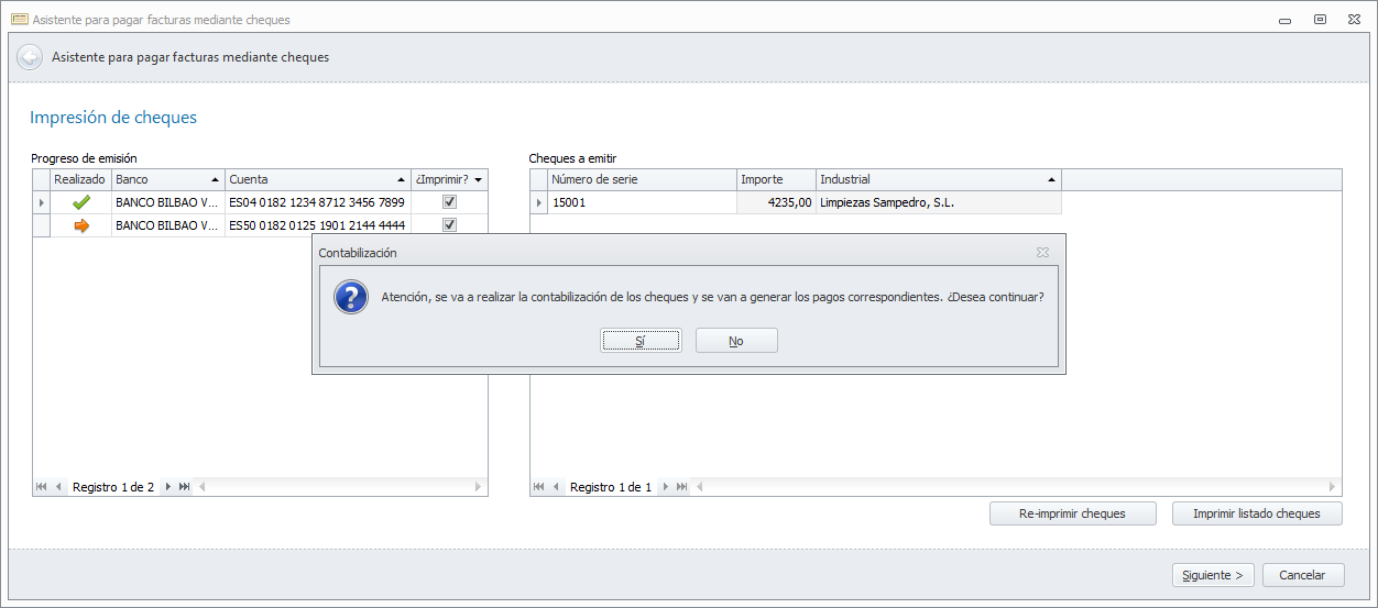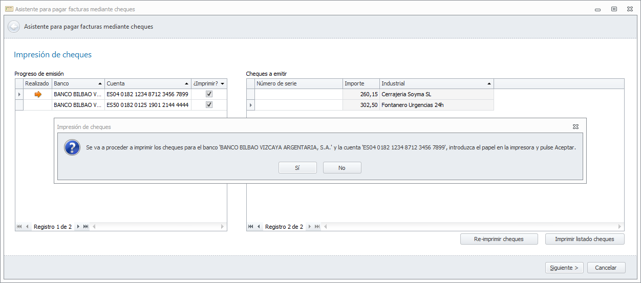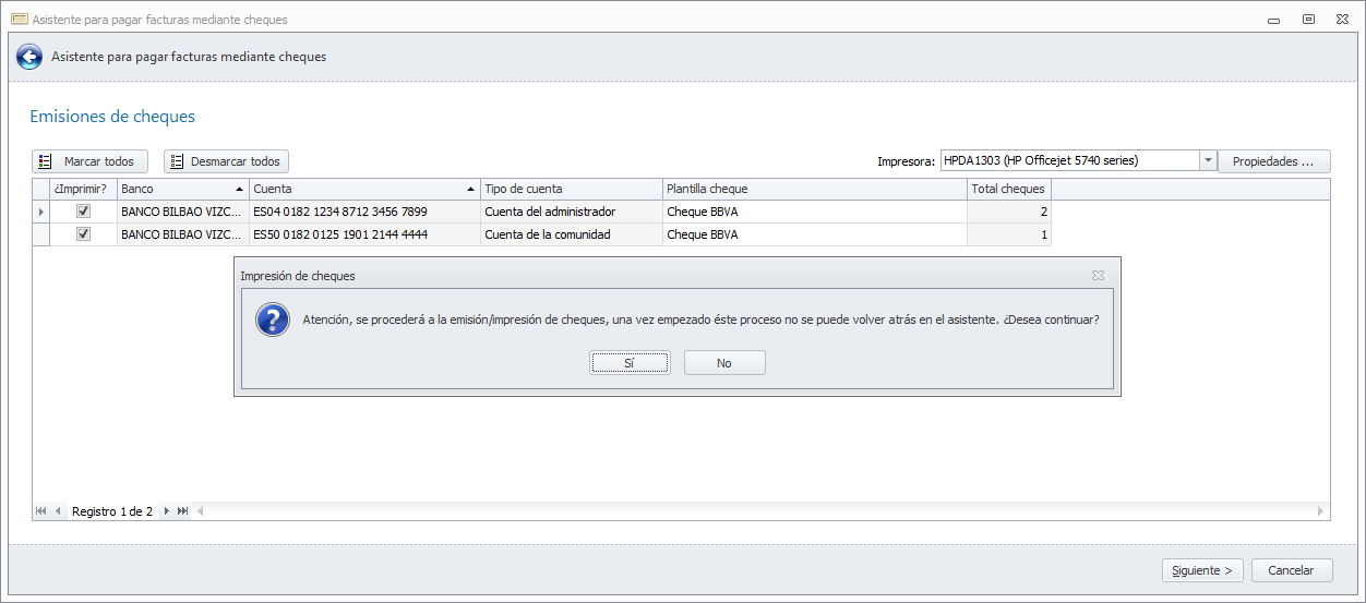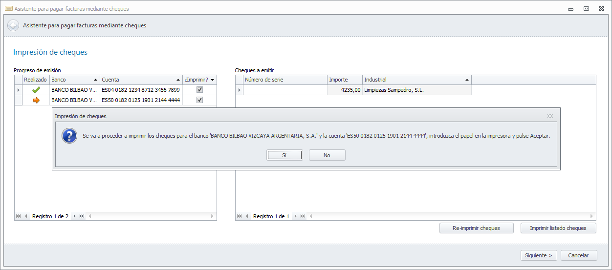 A continuación, muestra un mensaje para que confirme que tiene el papel de cheques puesto en al impresora para la primera de las cuentas bancarias. Al contestar Sí, se inicia la impresión.
