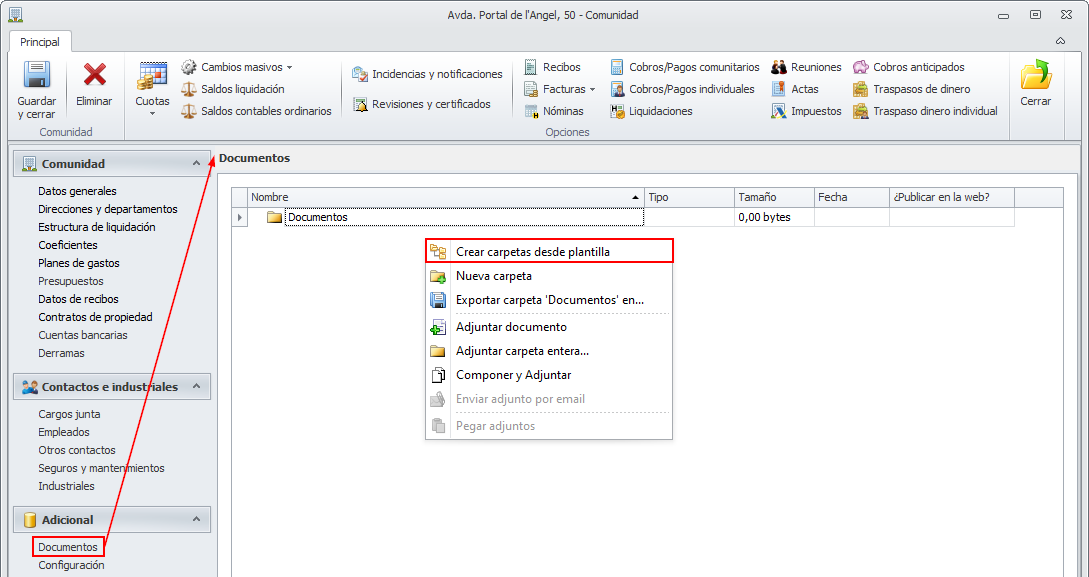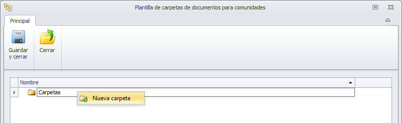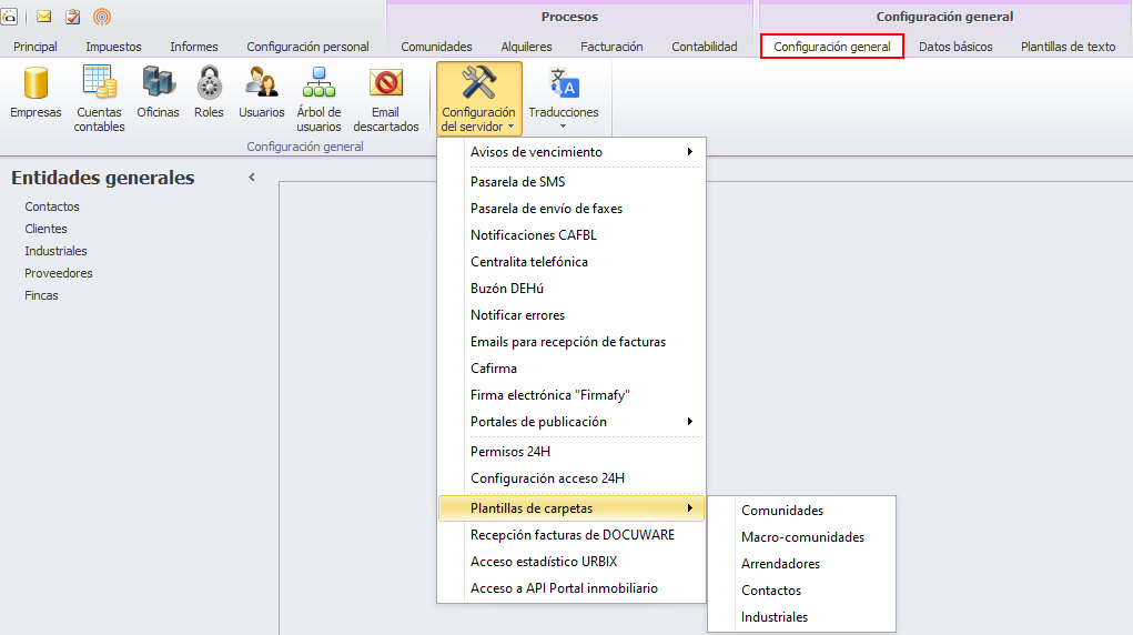 En el botón Configuración del servidor del menú Configuración general puede definir las plantillas de carpetas para las fichas de comunidades, macrocomunidades, arrendadores, contactos e industriales.
