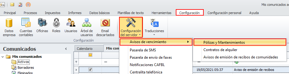 Vaya al menú Configuración, haga clic en Configuración del servidor y escoja Avisos de vencimiento y Pólizas y Mantenimientos.