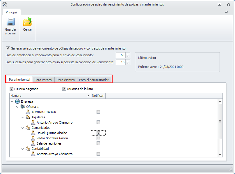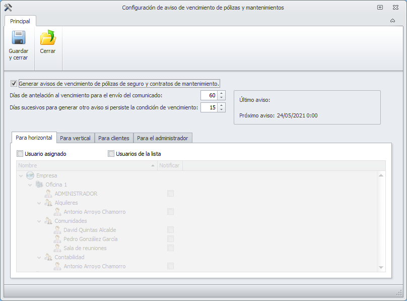 Para que adminet avise al administrador de los vencimientos de pólizas y mantenimientos se debe activar y configurar la gestión de esos avisos.