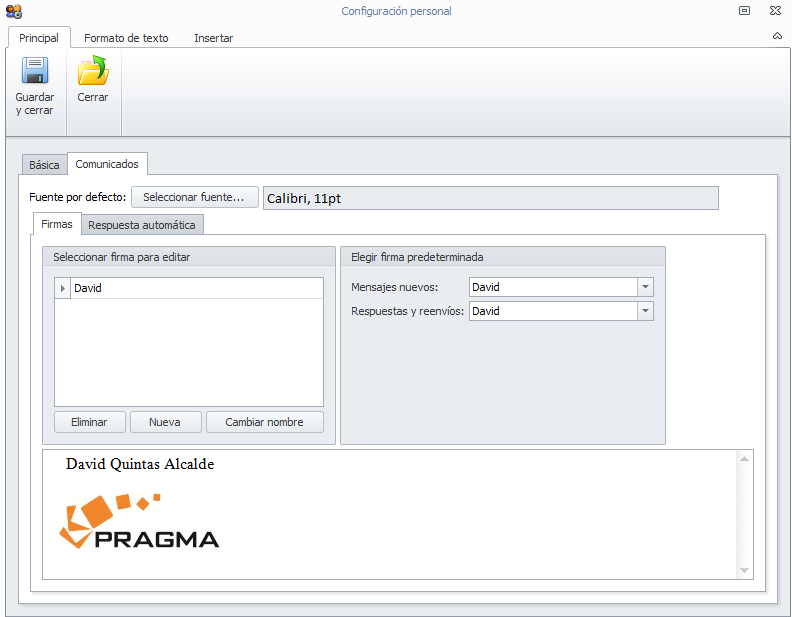 Crear firmas personalizadas para sus comunicados, ayudándose del editor de texto incorporado.