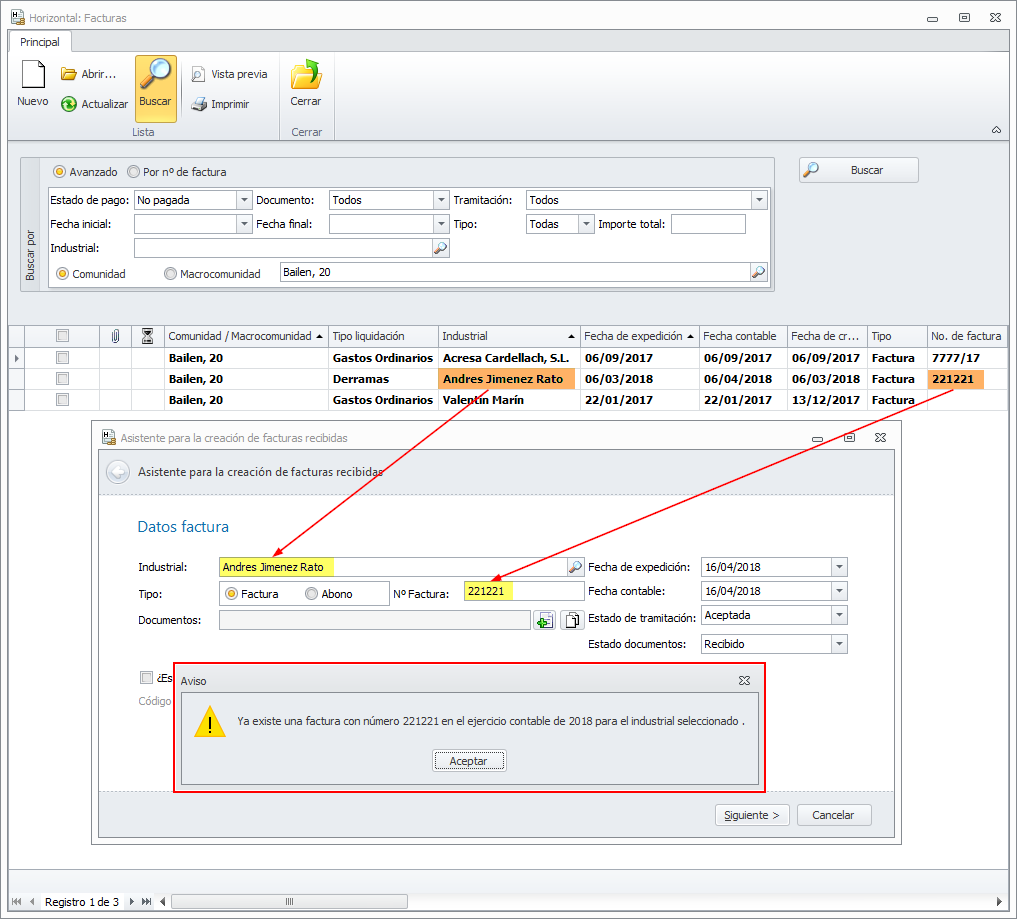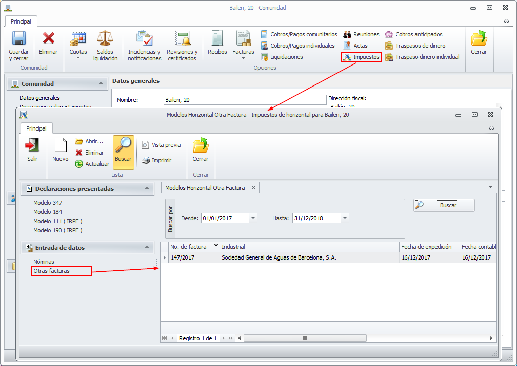 El control de duplicidad de factura, afecta también a las que se introducen en la sección Otras facturas del botón Impuestos de la ficha de la comunidad.