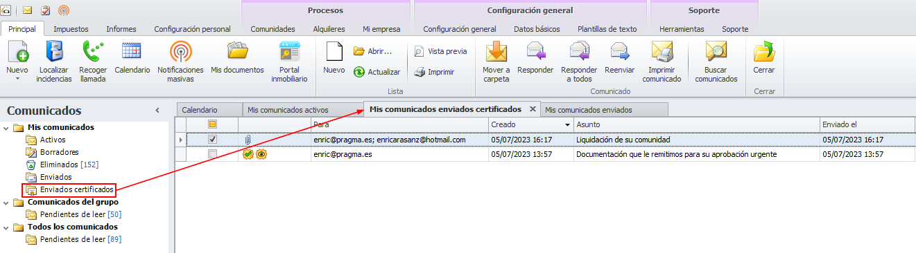 Un comunicado enviado como certificado, no se guarda en la carpeta Enviados sino en una carpeta denominada Enviados certificados.