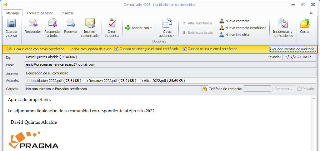 Al abrir el comunicado se puede ver la banda de opciones de certificado.