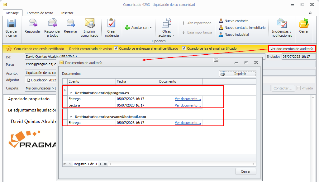 El botón Ver documentos auditoría muestra el estado de certificación de este comunicado.