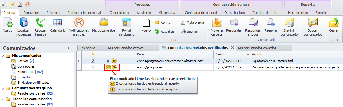 En la vista de comunicados enviados certificados se dispone de iconos que informan del estado de entrega y lectura de los mismos.