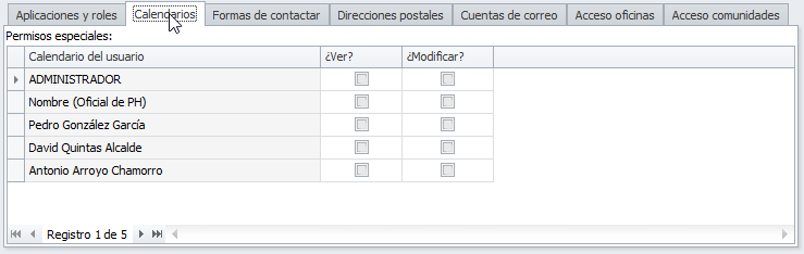 En la siguiente ventana, puede usted otorgar o restringir permisos para que el usuario que está editando pueda ver y/o modificar los calendarios de los demás usuarios de ADMINET.