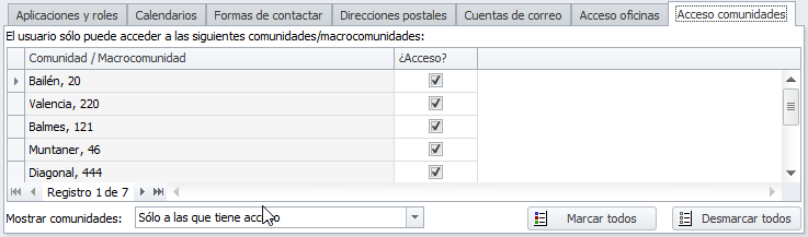 Se muestran las comunidades que pertenecen a las oficinas que tenga activadas el usuario en la pestaña anterior (Acceso oficinas). Por defecto todas las comunidades de la lista aparecen todas activadas. Se deberán desactivar aquellas a las que no se desee que ese usuario tenga acceso.