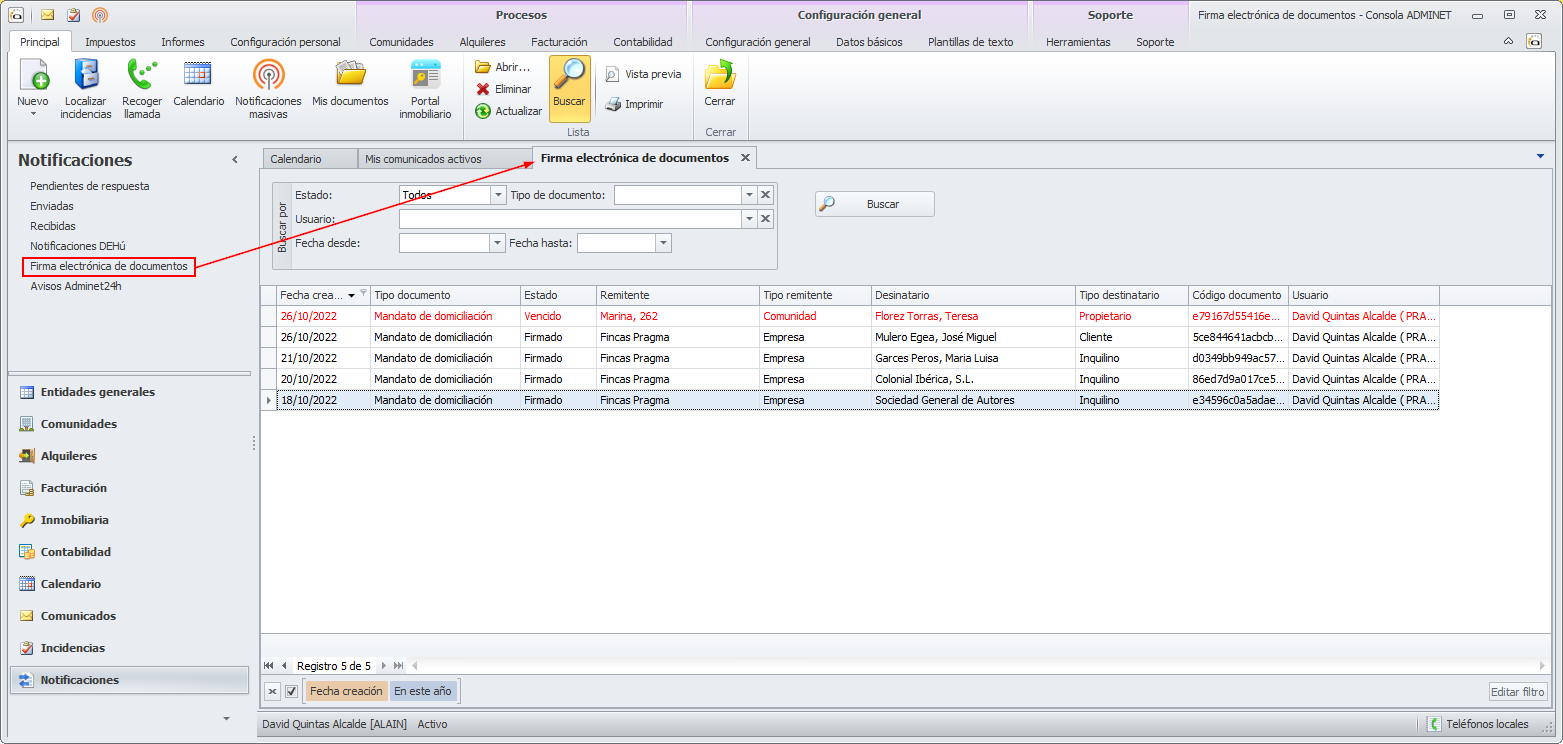 Adminet guarda un registro de las firmas electrónicas procesadas desde adminet. Puede acceder desde el apartado Notificaciones.
