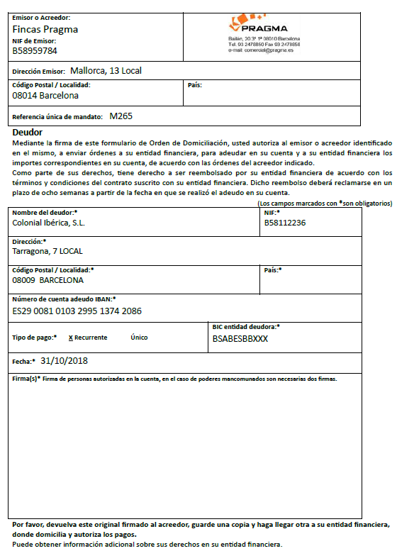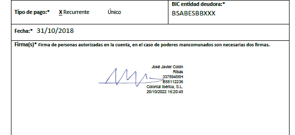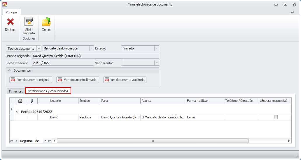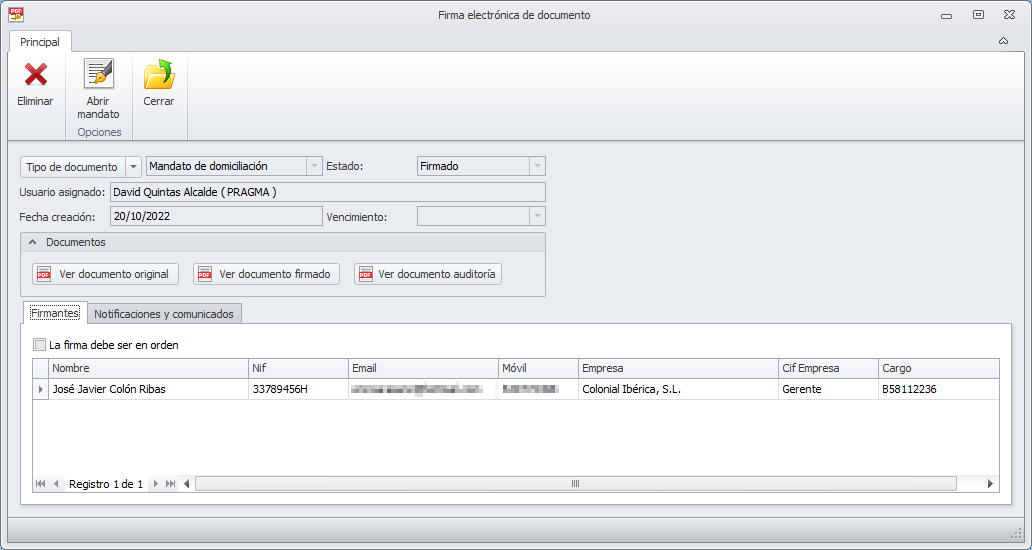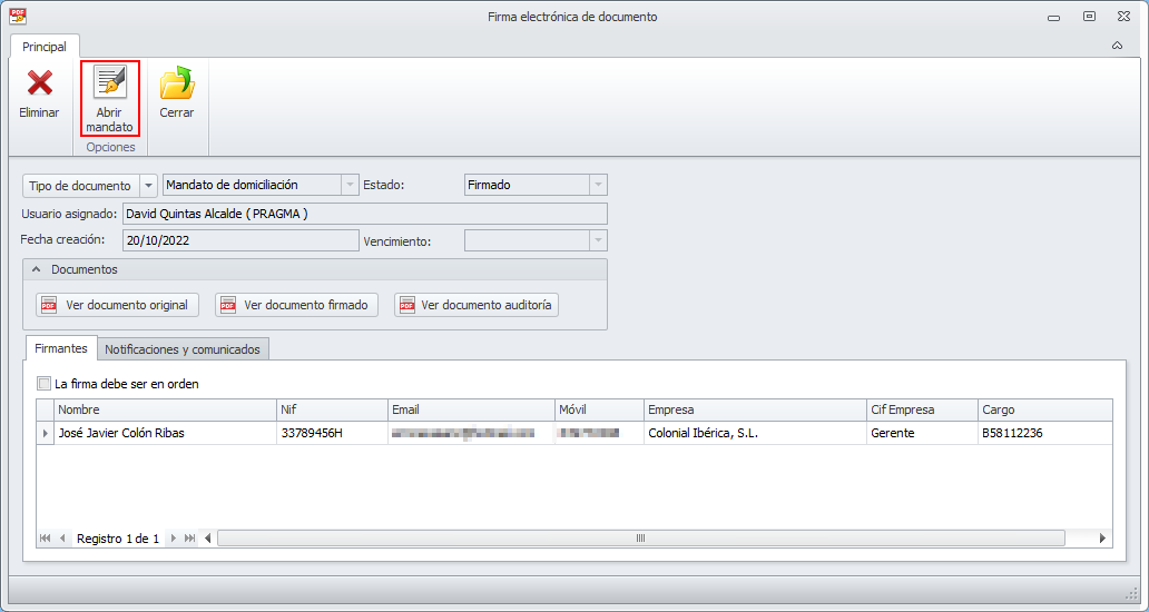 En la parte superior de la ficha se incorpora un botón que permite acceder a la ficha del documento que ha sido firmado. En el siguiente ejemplo se trata de un mandato de domiciliación.