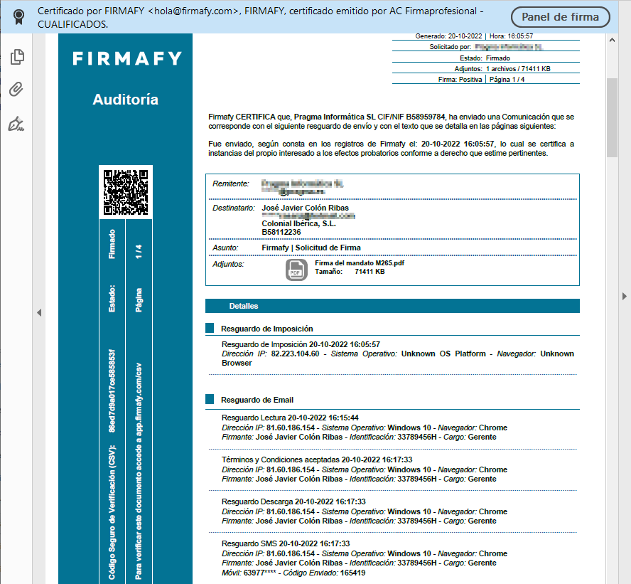 Si abre uno de los registros se muestra la información correspondiente a esa firma: el tipo de documento, los participantes en la firma y los documentos asociados.