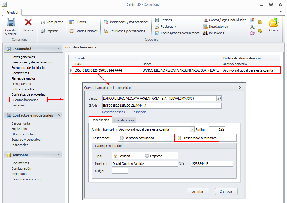 De este modo, aunque le haya dicho a adminet que la cuenta es de la comunidad, en los archivos de domiciliación el presentador será el administrador y el ordenante la comunidad.