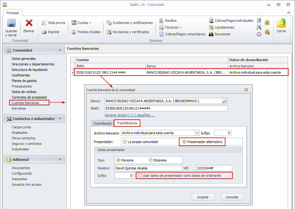 De este modo, aunque le haya dicho a adminet que la cuenta es de la comunidad, en los archivos de transferencia el presentador y el ordenante será el administrador.