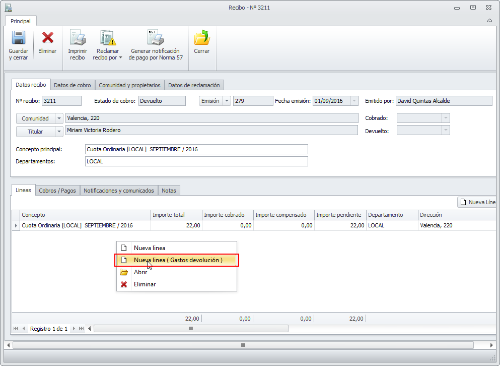 Al dar de alta un recibo devuelto de forma manual, el programa permite entrar una línea de recibo asociada a los gastos de devolución.