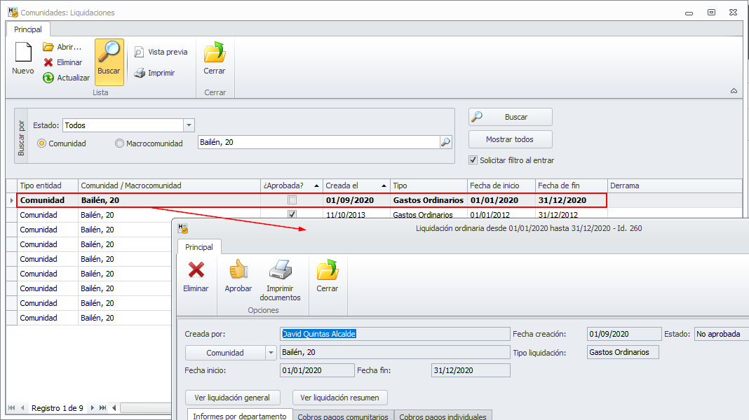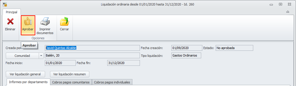 Para aprobar la liquidación, haga clic en el botón Aprobar.