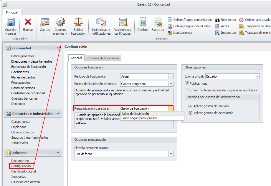 Por saldo de liquidación (Saldo anterior, más ingresos, menos gastos): El saldo a regularizar será igual al saldo de liquidación más los recibos pendientes que se hayan cobrado entre la fecha de emisión de la liquidación y la de aprobación. Además, si el saldo es negativo y se opta por no compensar los recibos pendientes, emitiendo el recibo de saldo por la diferencia entre el saldo de liquidación y los recibos pendientes de cobro, al cálculo anterior se le restará el importe de los recibos pendientes en el momento de aprobar la liquidación.