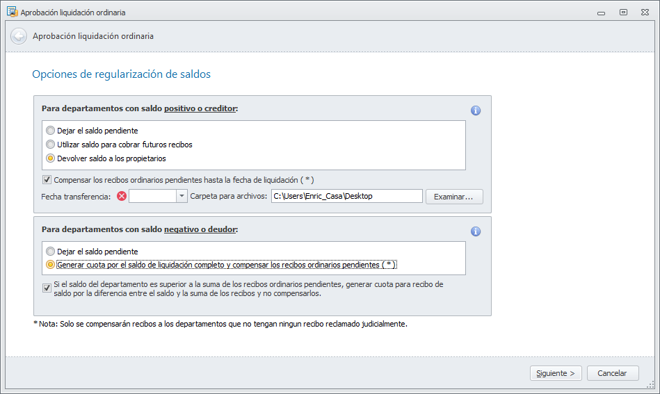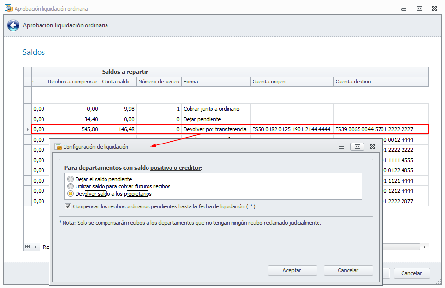 Compensar los recibos ordinarios pendientes hasta la fecha de liquidación. Si activa esta casilla, los recibos pendientes de departamentos cuyo saldo sea positivo y no tengan ningún recibo marcado como reclamado judicialmente, quedarán marcados como compensados en liquidación.