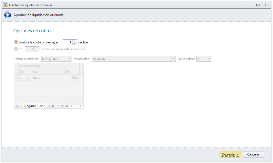 Si ha activado la opción Generar cuota por el saldo de liquidación completo y compensar los recibos ordinarios pendientes la siguiente ventana del asistente solicita si la cuota de saldo se emite junto a la cuota ordinaria o en recibo independiente. Además permite indicar si quiere fraccionar esa cuota en varios recibos. Haga clic aquí para más información.